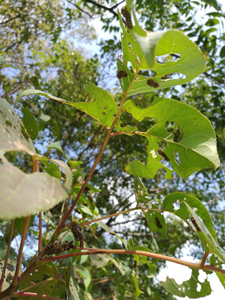 重阳木锦斑蛾危害重阳木。成虫白天在重阳木树冠或其他植物丛上飞舞,吸食补充营养,卵产于叶背,幼虫取食叶片,严重时将叶片吃光,仅残留叶脉等。上海地区一年发生3代,以老熟幼虫在树皮缝、树洞、石块下、枯落叶上结茧越冬,4月下旬可见越冬代成虫。3代幼虫危害期分别为6月下旬、7月上中旬、8月下旬至9月下旬,幼虫取食叶片,低龄幼虫群集危害,高龄后分散危害。老熟幼虫吐丝缀地做茧,或在叶片上结薄茧。9月22日,金山区林业站工作人员在张堰镇踏查发现重阳木锦斑蛾幼虫危害重阳木,株发生率100%,为重度发生。 防治适期:6月下旬-9月下旬 防治方法:(1)树干涂白,消灭树皮内越冬幼虫。(2)利用草把诱杀幼虫,并清除枯枝落叶石块下的越冬蛹。(3)药剂防治:幼虫发生期用1.2%苦烟乳油800-1000倍液,或25%灭幼脲Ⅲ号1500-2000倍液,或0.36%百草一号1000倍液防治。